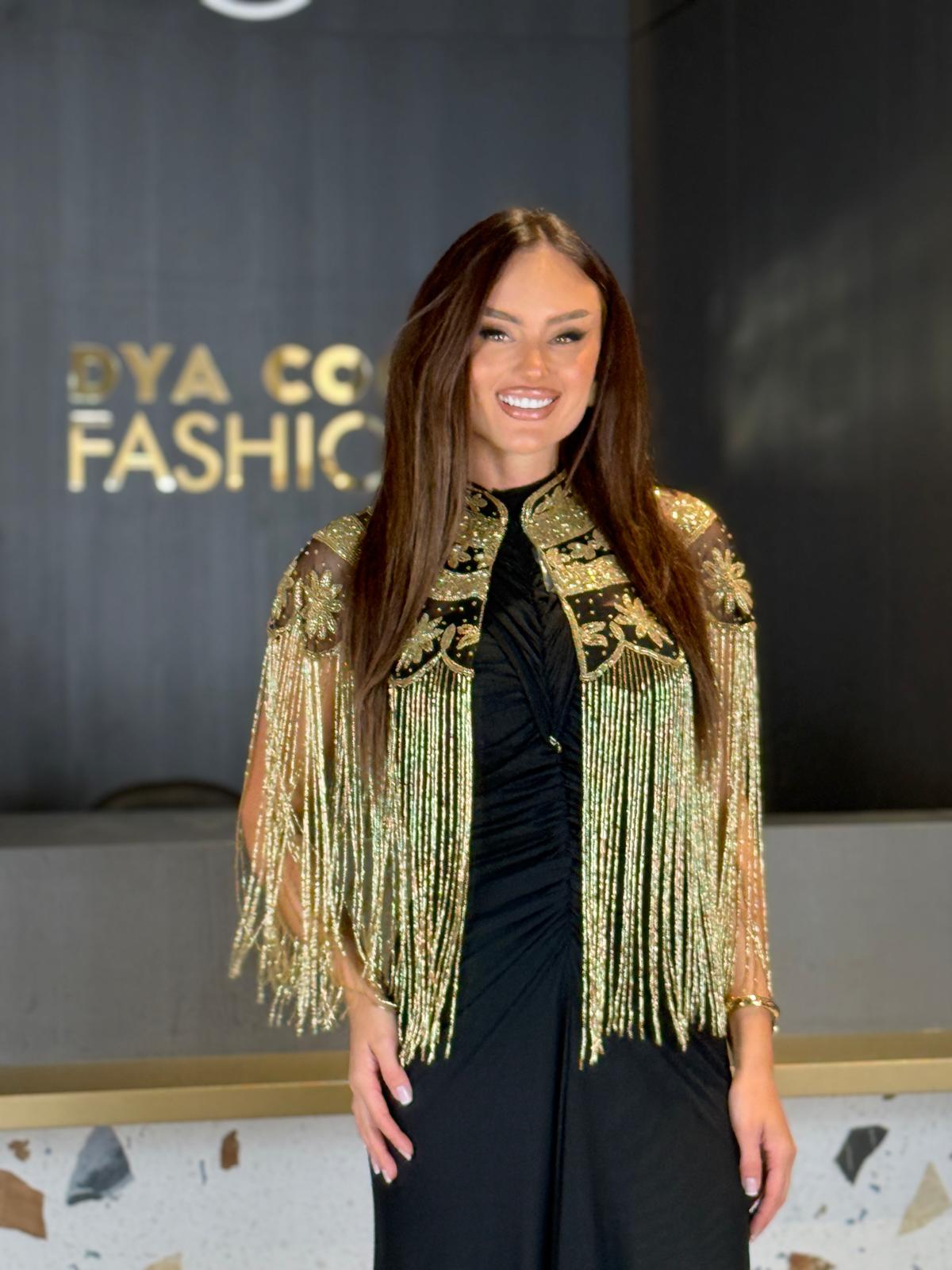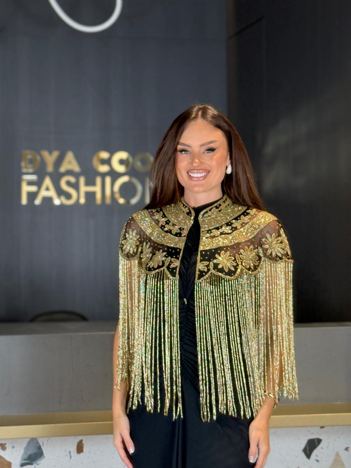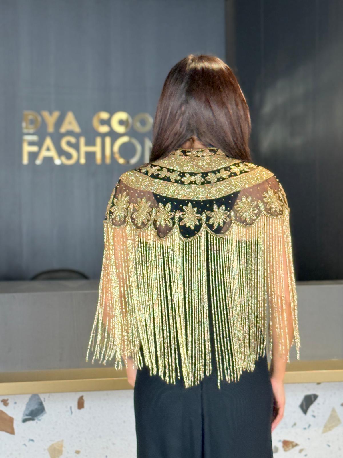 Capă statement realizată manual, decorată integral cu mărgele fine și franjuri lungi ce creează un efect spectaculos la fiecare mișcare. Designul bogat, cu aplicații aurii și argintii, adaugă un aer luxuriant și sofisticat. Ideală pentru rochii elegante, evenimente speciale sau apariții de impact, această piesă transformă instant orice ținută într-una exclusivistă.