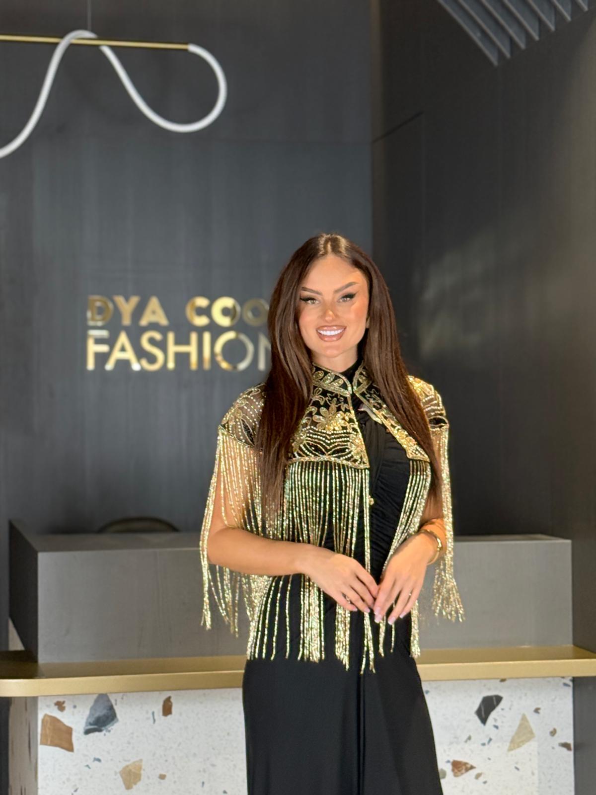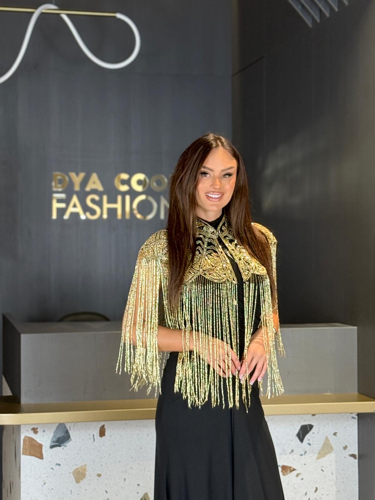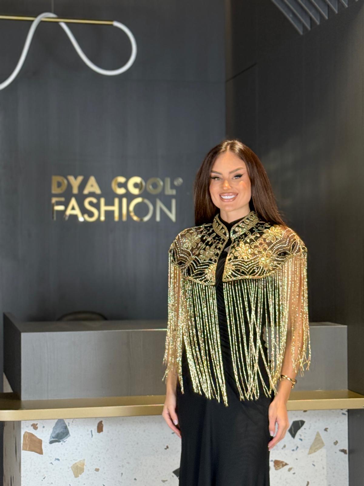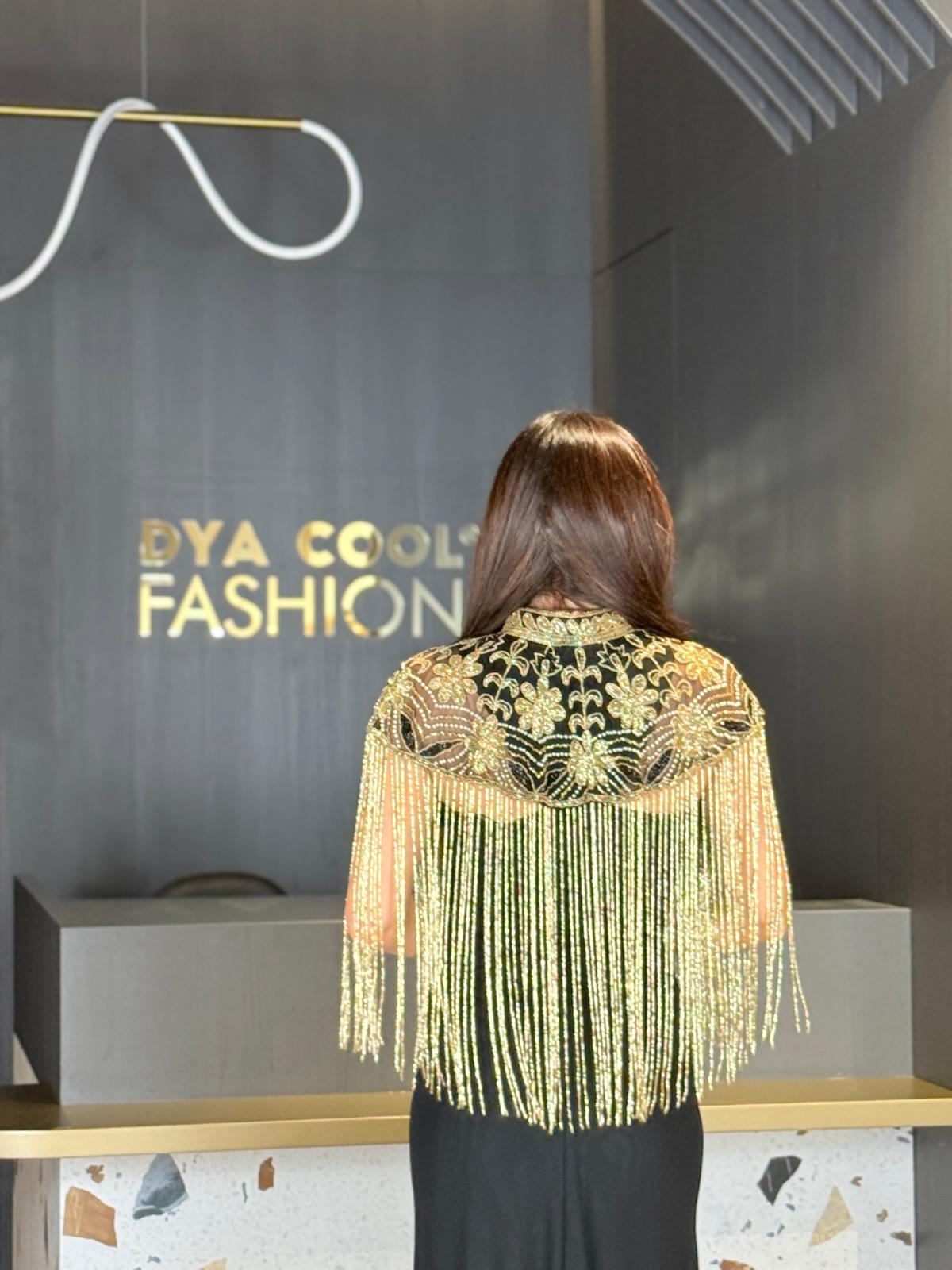 Capă statement realizată manual, decorată integral cu mărgele fine și franjuri lungi ce creează un efect spectaculos la fiecare mișcare. Designul bogat, cu aplicații aurii și argintii, adaugă un aer luxuriant și sofisticat. Ideală pentru rochii elegante, evenimente speciale sau apariții de impact, această piesă transformă instant orice ținută într-una exclusivistă.