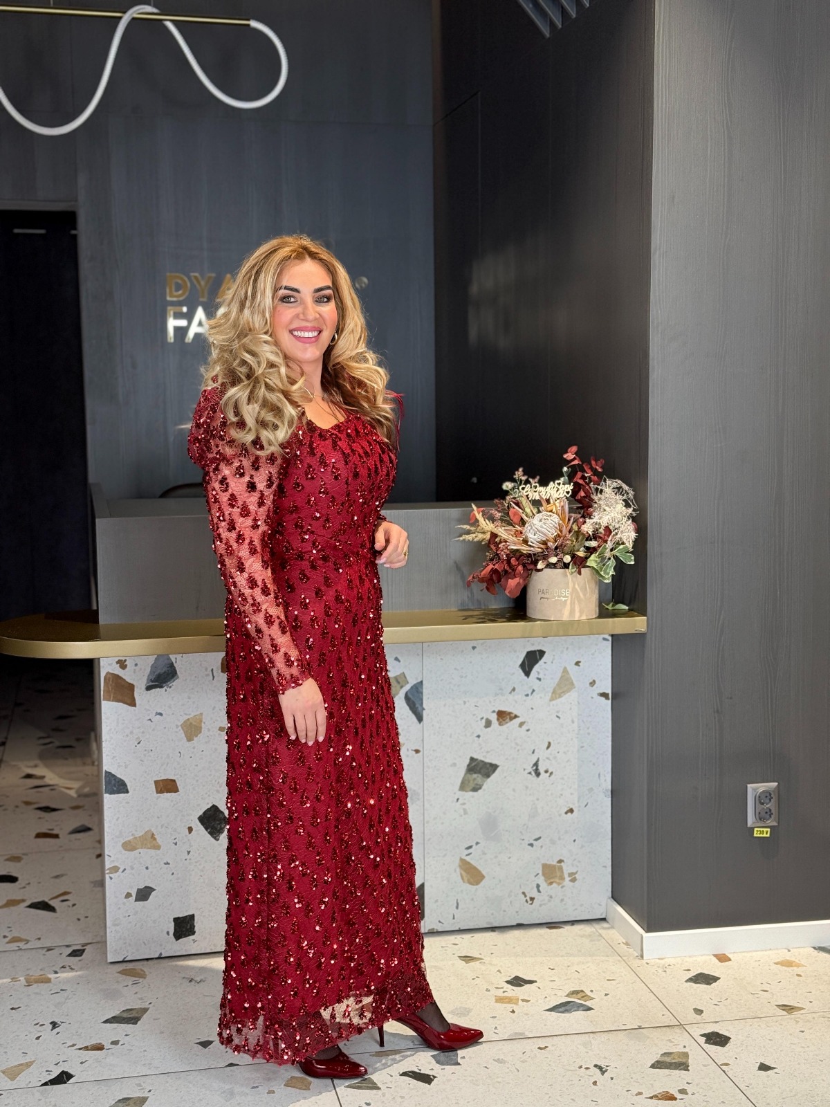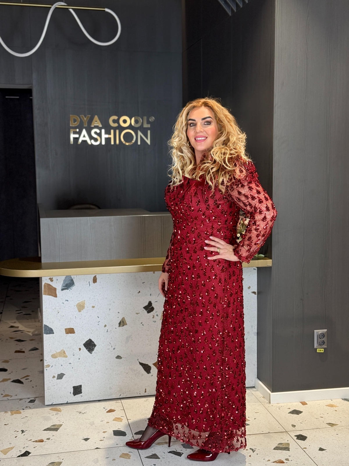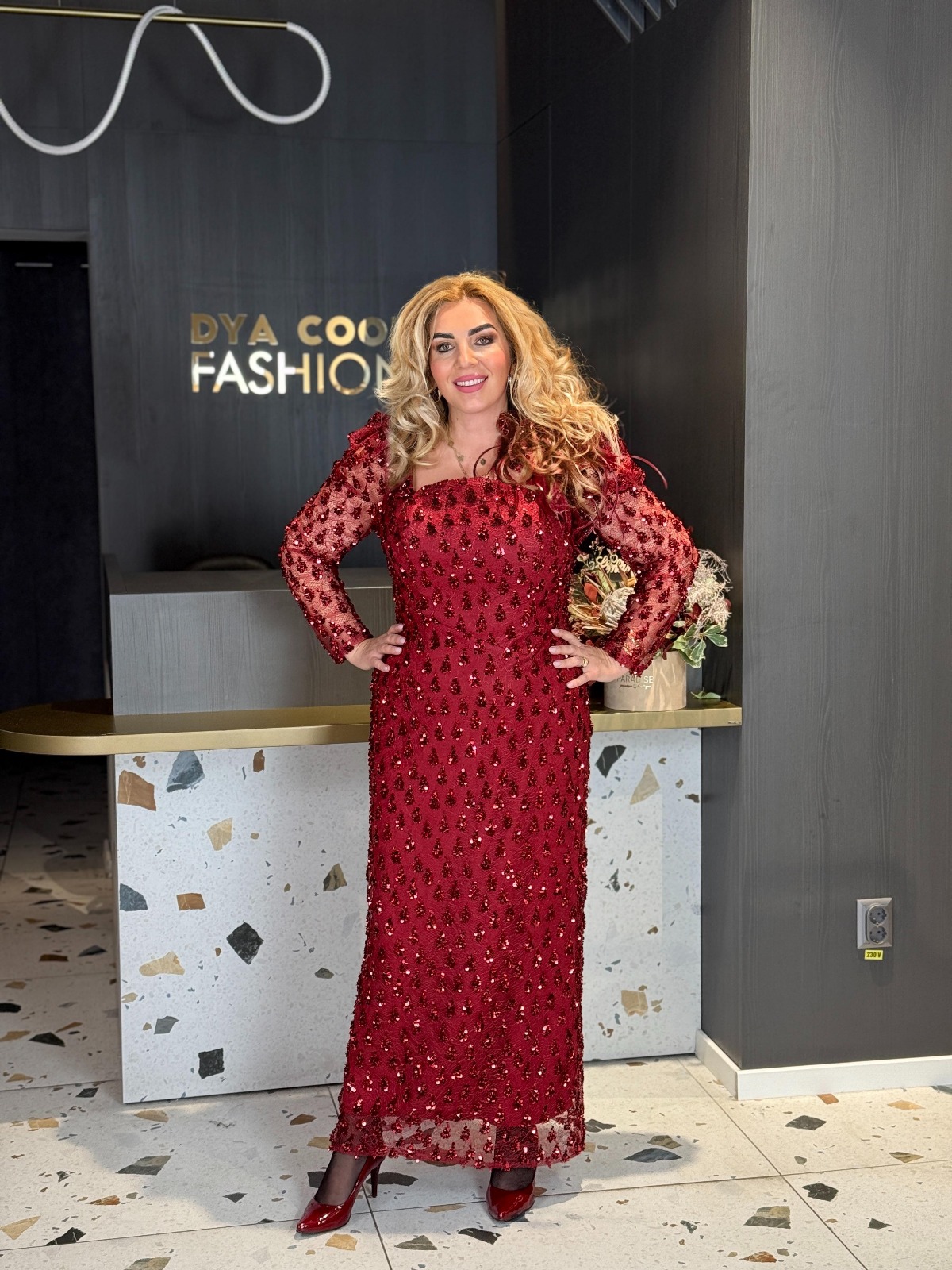 Rochie lungă roșu bordo, cu broderie densă și perle aplicate manual, completată de mâneci bufante elegante. O creație luxoasă, cu o vibrație regală, concepută pentru apariții memorabile la evenimente speciale.