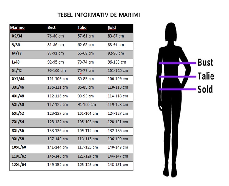 Vă recomandăm să aveți la îndemână măsurătorile proprii (Bust, Talie, Șolduri, ) pentru a alege mărimea potrivită.